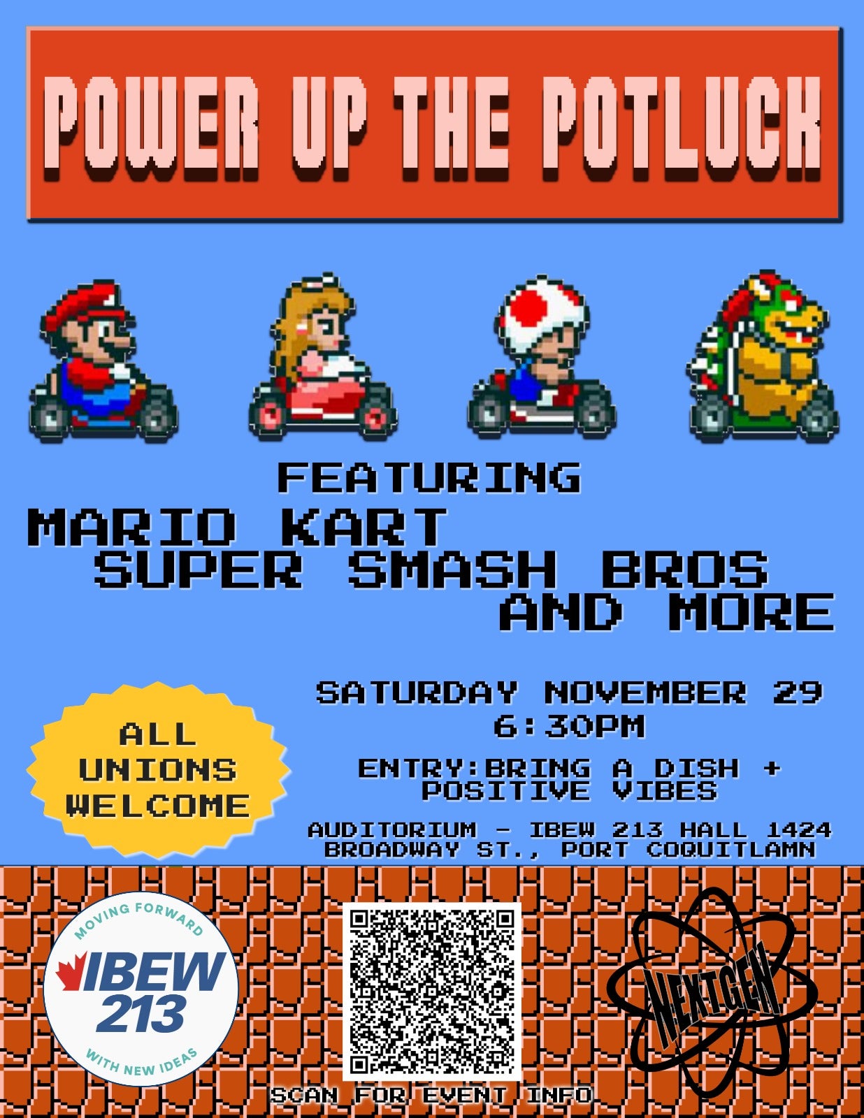 The IBEW Local 213 NextGen Committee (Young Workers 35 and under) is hosting a Video Game and Potluck Night to bring together young workers from across the labour movement. This is a great opportunity to connect, share experiences, and strengthen solidarity between unions in the Lower Mainland.